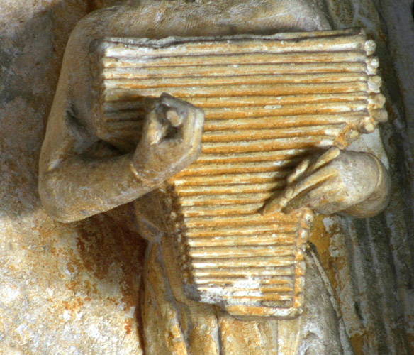 L'instrument apparaît fréquemment du XIIIe au XVe siècle, prenant des formes variées. Nous nous sommes inspirés d'un instrument à la forme dite "en groin de porc"!, sculpté sur le tympan de la porte de la sacristie, dans le cloître de l'Abbaye de Saint-Wandrille.